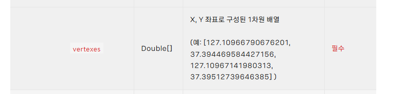 그러고 for 반복문을 통해 vertexes 배열을 두 칸씩 건너뛰면서 x, y 좌표를 추출해서 카카오맵에서 사용하는 LatLng 객체로 변환하고 linePath 배열에 추가했다.