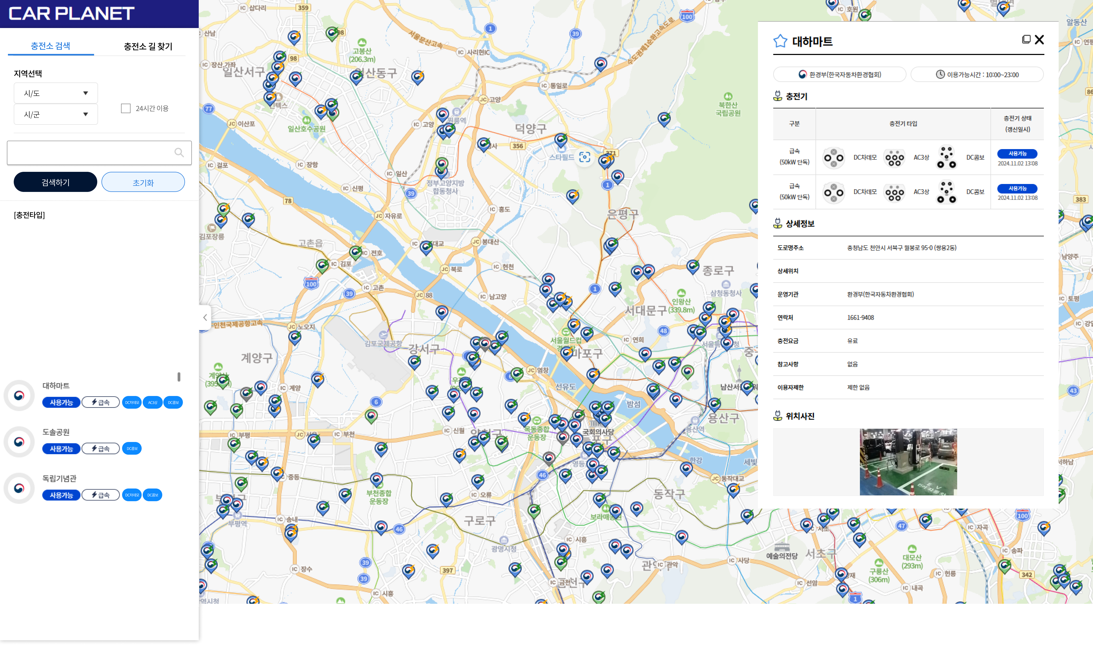 지도에 떠 있는 아이콘이나 결과값에 나온 리스트를 누르면 우측 상단에 팝업처럼 충전소 정보를 제공할 예정입니다.