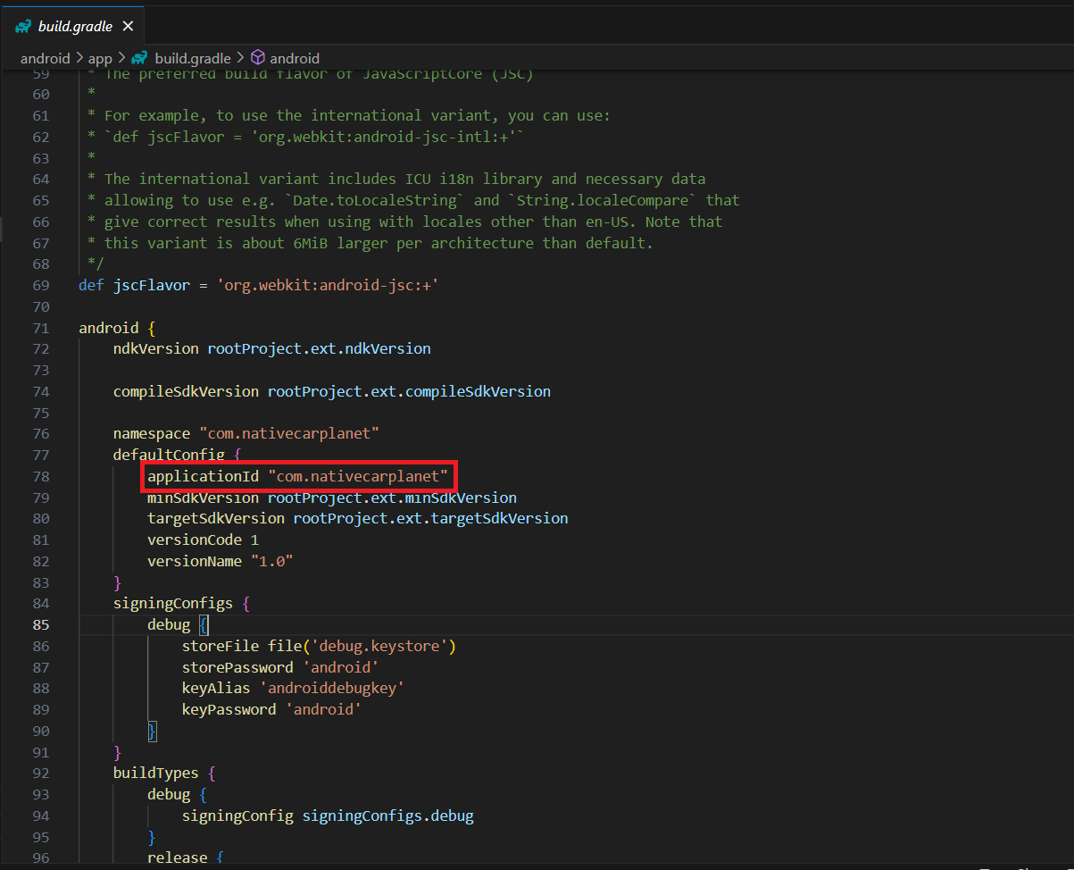 1번에 해당하는 패키지명은 프로젝트 폴더 안에 android>app>build.gradle에 있는 applicationId를 사용했다.