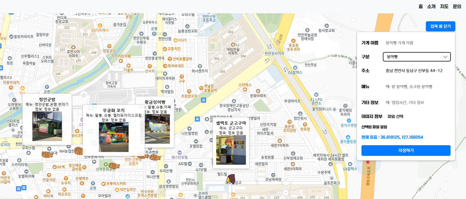 addStoreMarkers는 fishstore 배열을 돌면서 각 가게들의 정보를 처리하고, 지도에 마커와 오버레이를 생성한다.