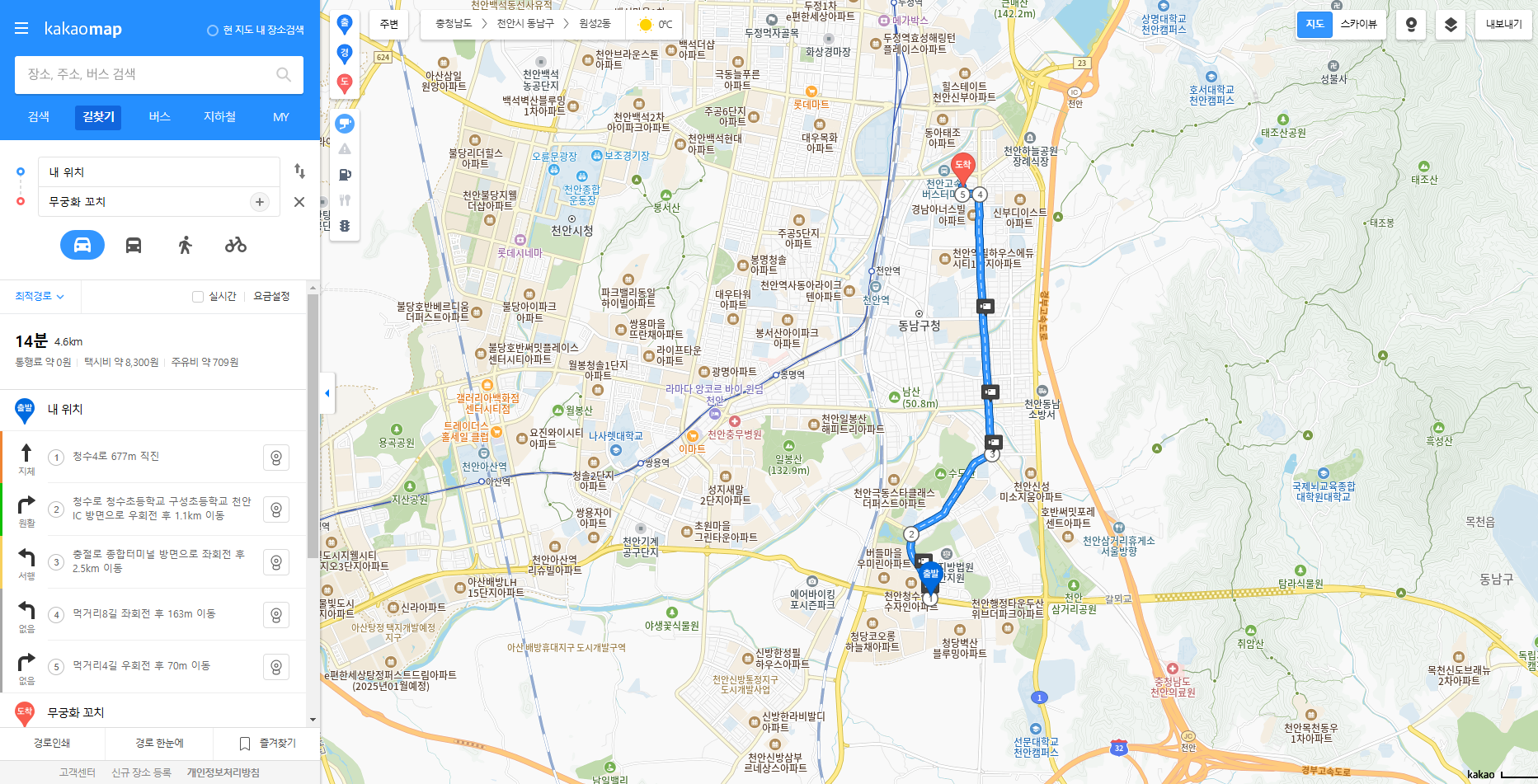 길 찾기 버튼을 누르면 새 창으로 카카오 지도 길찾기 기능에 출발지와 목적지가 설정되어 표시되게 하였다.